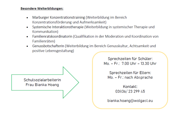 Schulsozialarbeit richtet sich an alle Schülerinnen und Schüler der Schule, insbesondere jedoch an jene in besonderen Lebenssituationen und unterstützt durch Beratung und Begleitung bei der Bewältigung von Alltagsproblemen.